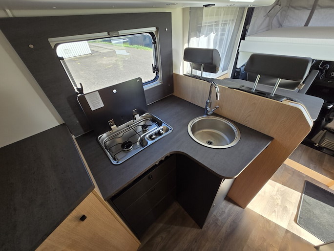 De keuken heeft een 2-pits gasstel, koelkast met vriezer en een wasbak met mengkraan. In de doucheruimte is behalve een douche, ook een toilet en wastafel met mengkraan aanwezig. Onder de enkele bedden is een grote opbergruimte voor bijvoorbeeld uw stoelen en tafel.
