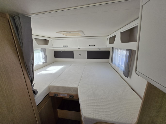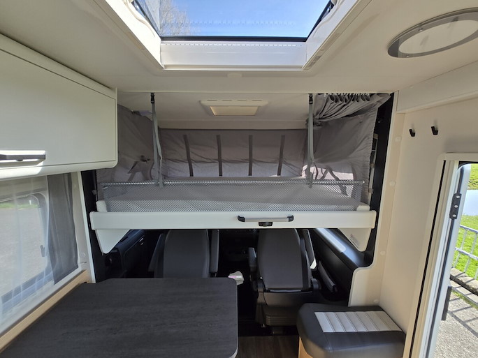 Slapen kan op de ruime enkele bedden achterin en bij meer dan 2 personen kan het ook het 2-persoons hefbed gebruikt worden. Dit hefbed zit boven de voorstoelen.