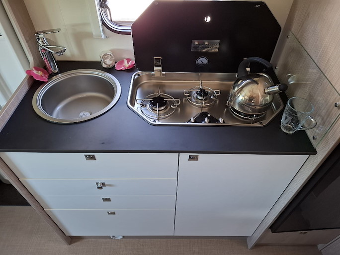 De keuken heeft een 3-pits gasstel, koelkast met vriezer en een wasbak met mengkraan.