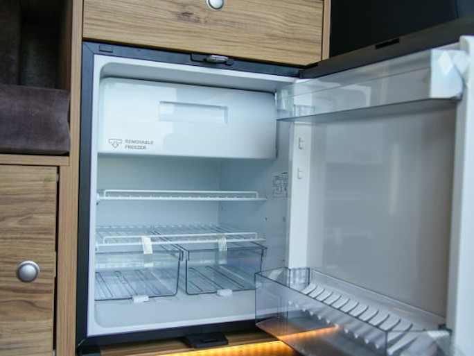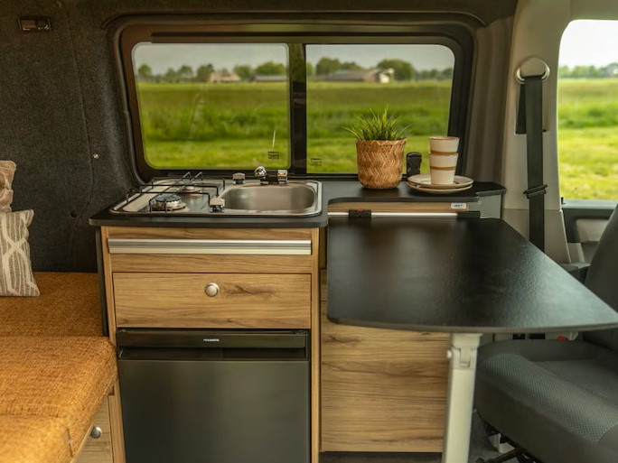 Binnen vind je een slim ingedeelde keuken met kookplaat en spoelbak, volop opbergruimte en een royaal bed voor twee personen.