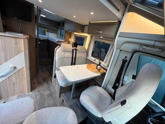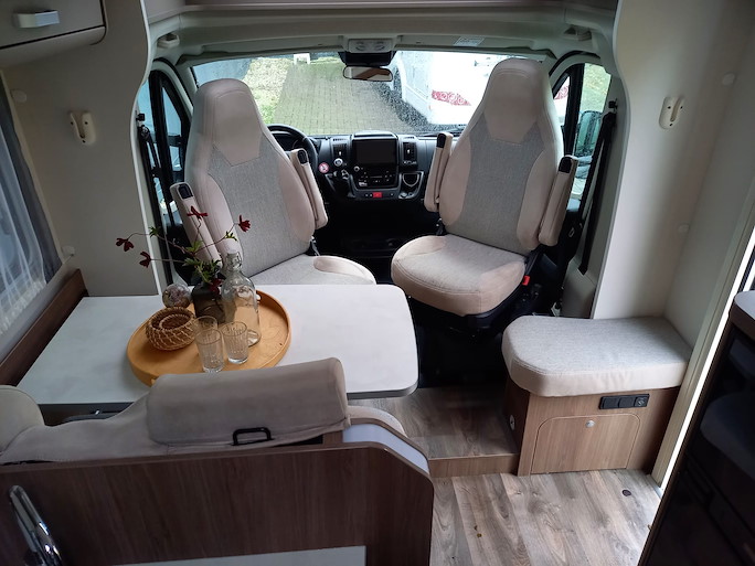 De Carado T338 is een mooie ruime half-integraal camper met enkele bedden. Net onder de 7 meter. Deze indeling heeft 2 draaibare voorstoelen en een zijbank, zodat u ruim kunt zitten.