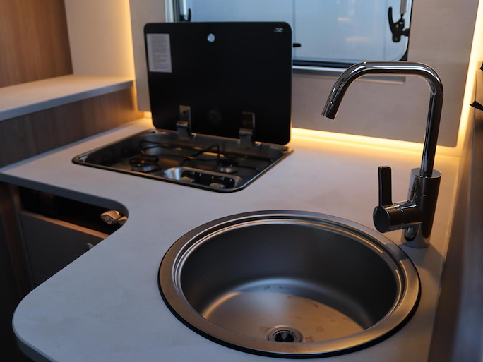 De keuken heeft een gasstel, koelkast met vriezer, wasbak met mengkraan.In de doucheruimte zijn een toilet, wastafel met mengkraan en douche aanwezig.