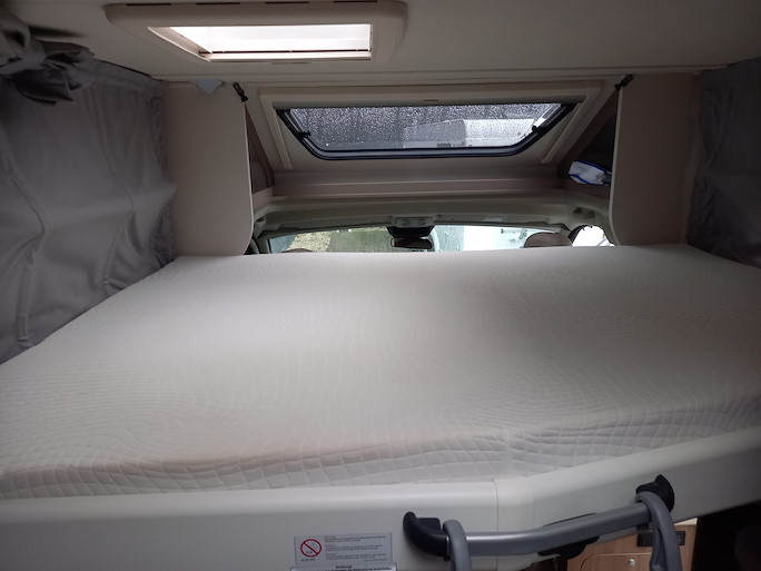 Slapen kan op de 2 enkele bedden achterin en bij meer dan 2 personen kan ook het 2-persoons hefbed gebruikt worden.