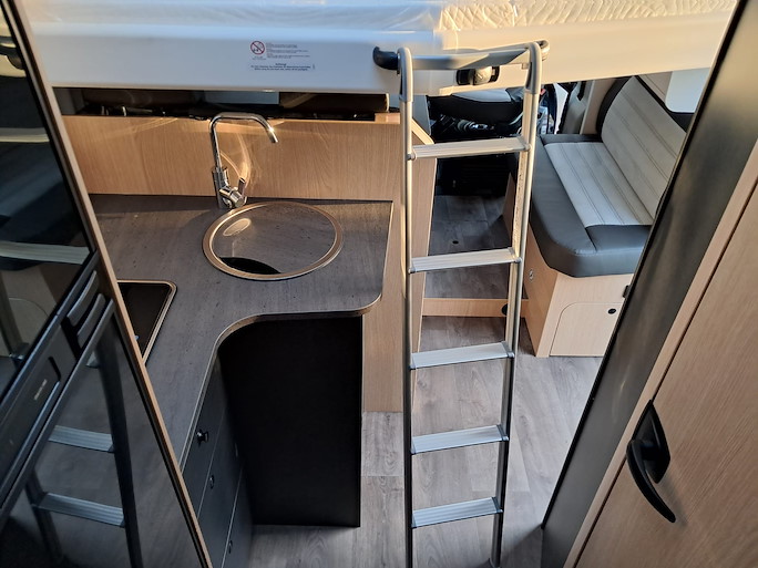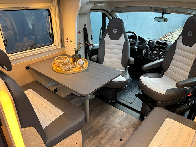 De Sunlight T67 is de meest ruime half-integraal camper met enkele bedden die we hebben. Deze indeling heeft 2 draaibare voorstoelen en kleine zijbank, zodat u ruim kunt zitten.
