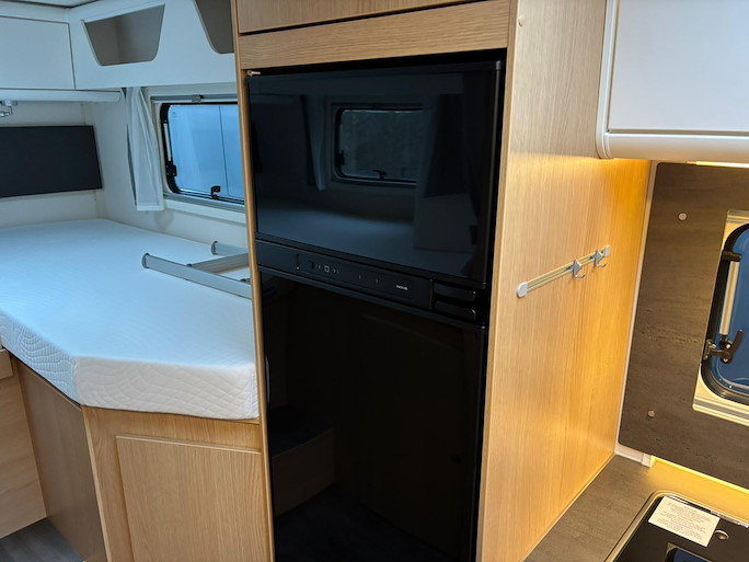 De keuken heeft een 2-pits gasstel, koelkast met vriezer en een wasbak met mengkraan. De douche- en toiletruimte zijn van elkaar gescheiden. De toiletruimte bevat tevens een wastafel met mengkraan.