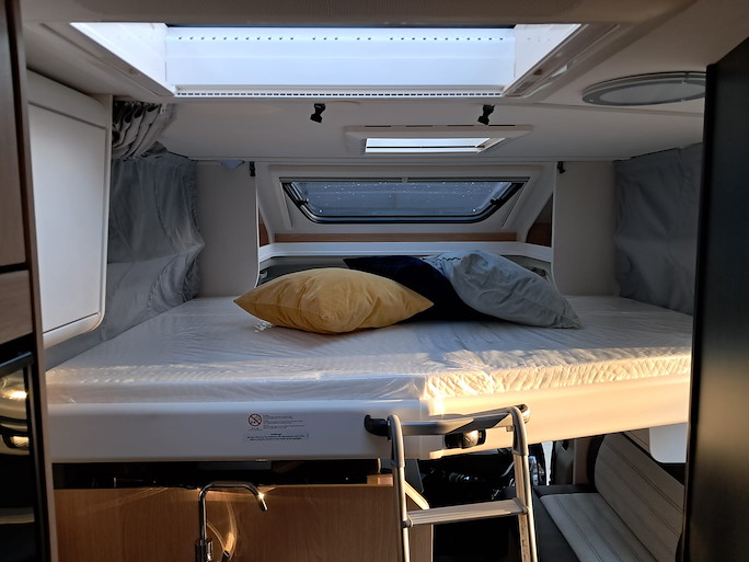 Slapen kan op de 2 enkele bedden achterin en bij meer dan 2 personen kan ook het 2-persoons hefbed gebruikt worden.