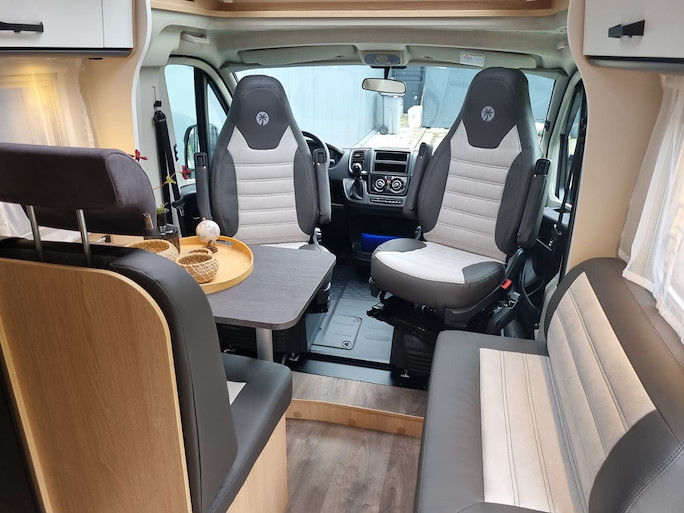De Sunlight V67S Adventure automaat is een compacte half-integraal camper met enkele bedden. Deze indeling heeft 2 draaibare voorstoelen en een zitbank, waardoor u met 4 personen in de camper kunt zitten.