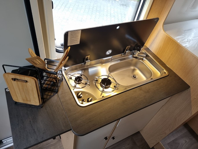 De keuken heeft een 2-pits gasstel, koelkast met vriezer en een wasbak met mengkraan.