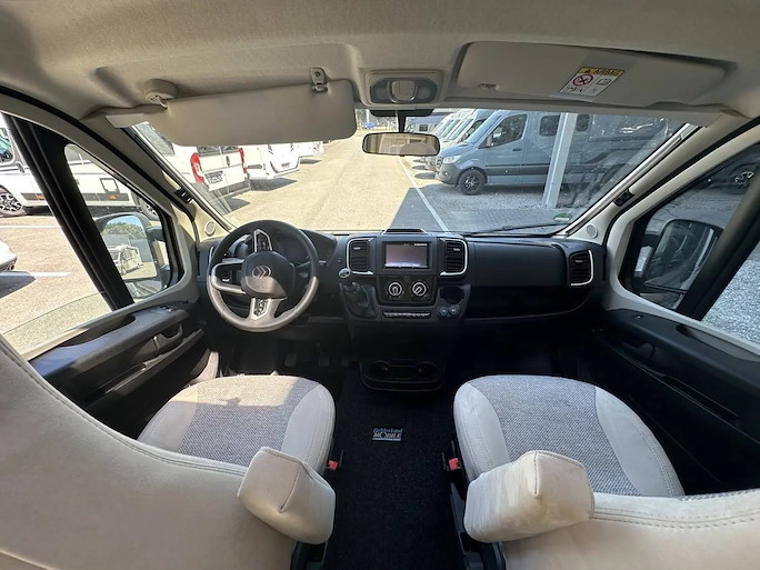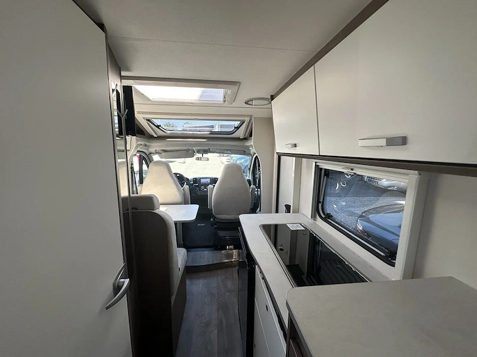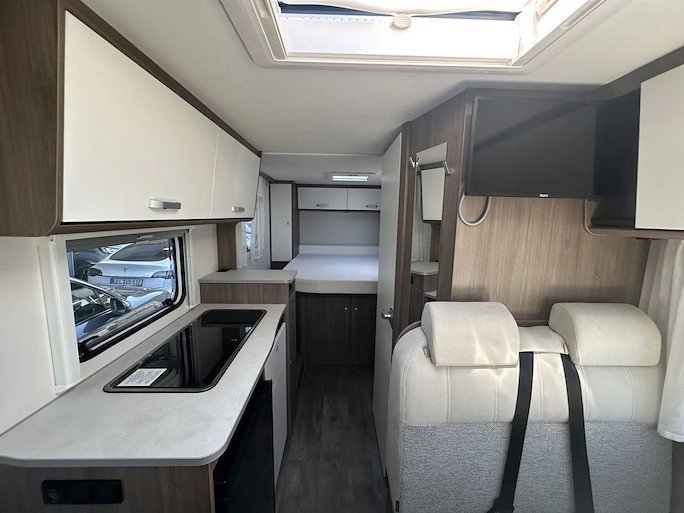 Deze indeling heeft 2 draaibare voorstoelen en een zitbank, waardoor u met 4 personen in de camper kunt zitten. Slapen kan op het grote en comfortabele queens bed achterin. Het queens bed zorgt voor extra toegankelijkheid.