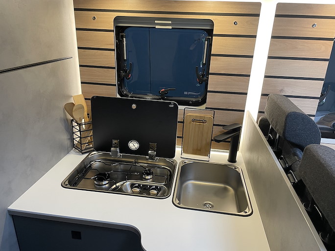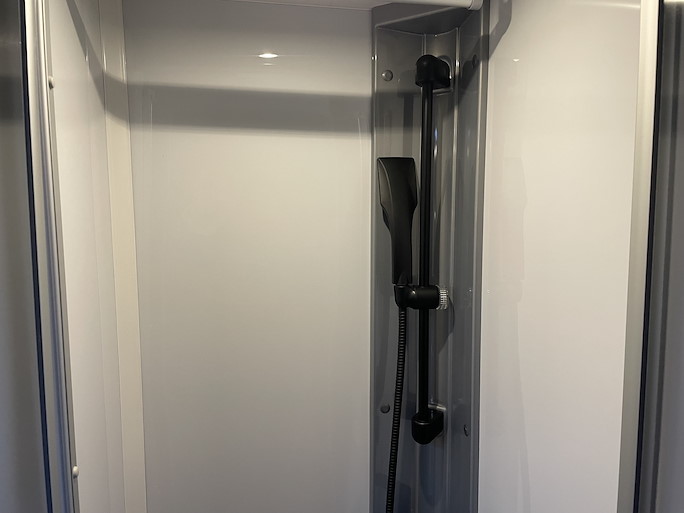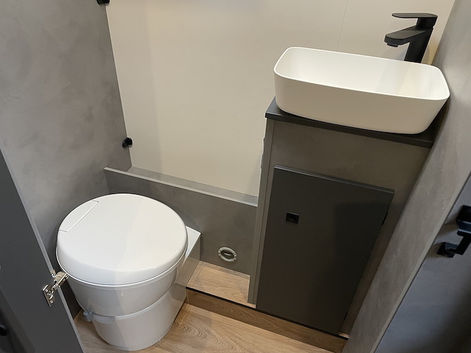De keuken heeft een 2-pits gasstel, koelkast met vriezer en een wasbak met mengkraan. De douche- en toiletruimte zijn van elkaar gescheiden. De toiletruimte bevat tevens een wastafel met mengkraan.