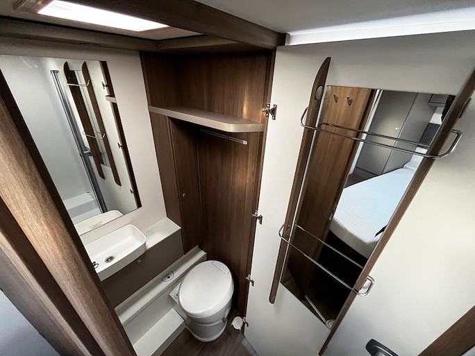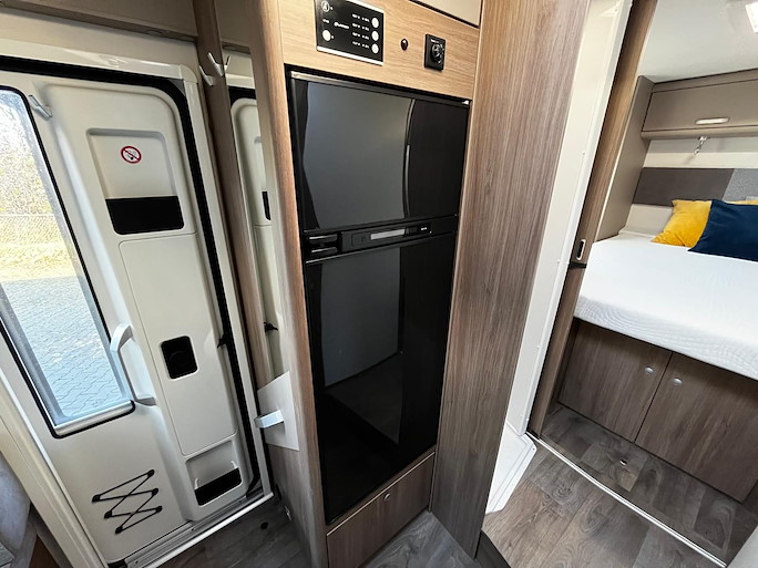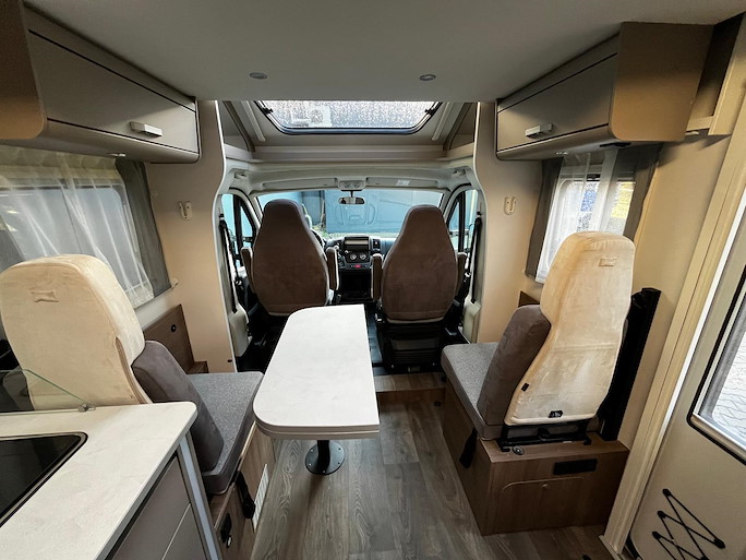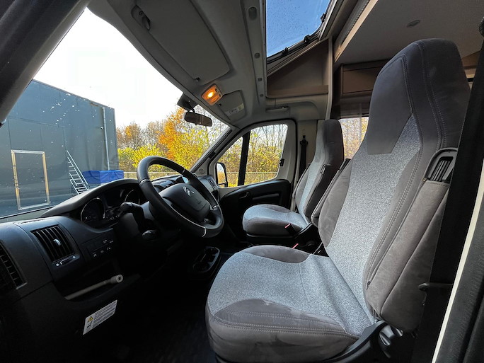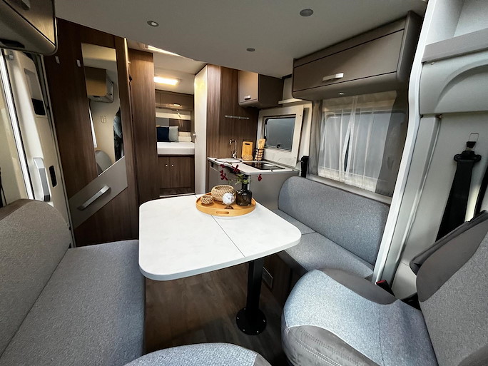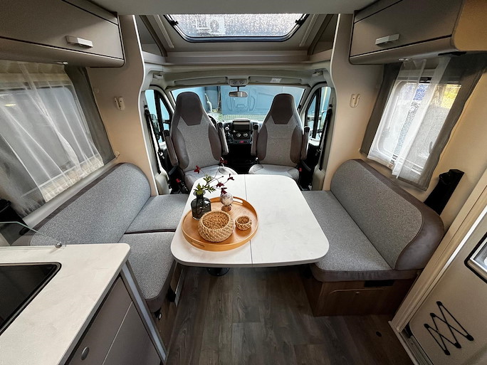 De Carado T459 is de meest half-integraal camper met queensbed (vrijstaand bed) die we hebben. Het slaapgedeelte achterin is met een deur af te scheiden van het voorste deel van de camper. Deze indeling heeft 2 draaibare voorstoelen en een Face to Face zit, waardoor u zeer ruim kunt zitten. Om tijdens het rijden in de gordel te kunnen zitten, moeten de twee bankjes vervangen worden voor 2 losse stoelen.