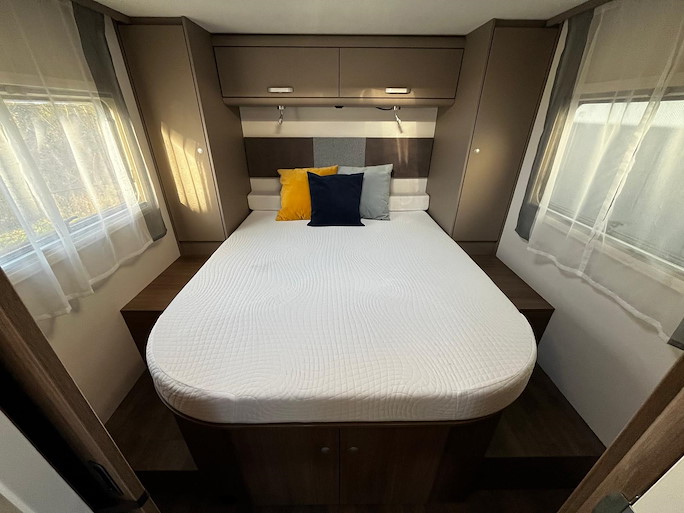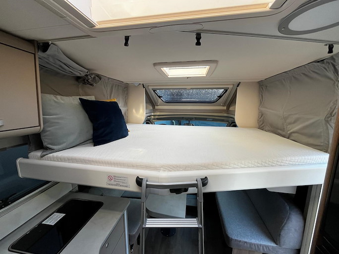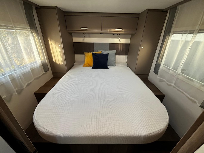 Slapen kan op het mooie, brede en vrijstaande queensbed achterin en bij meer dan 2 personen kan ook het 2-persoons hefbed gebruikt worden.