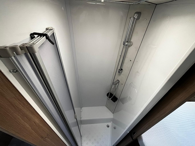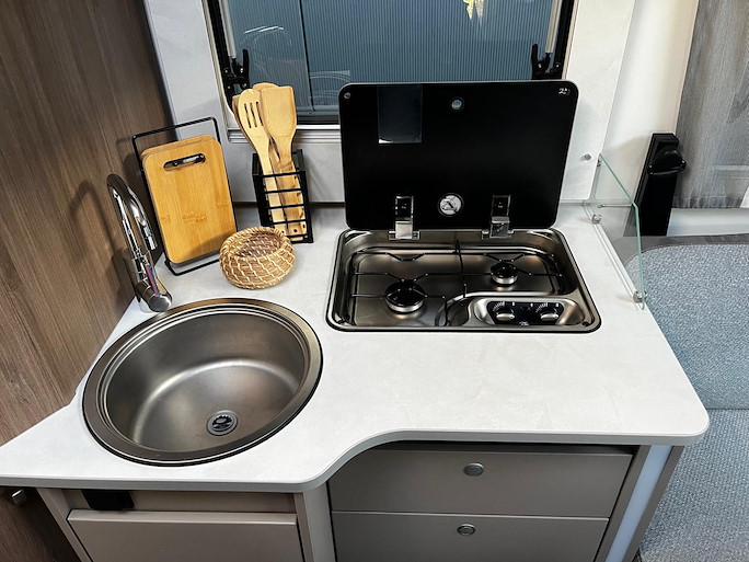 De keuken heeft een gasstel, koelkast met vriezer en een wasbak met mengkraan. De douche- en toiletruimte zijn van elkaar gescheiden. De toiletruimte bevat tevens een wastafel met mengkraan.