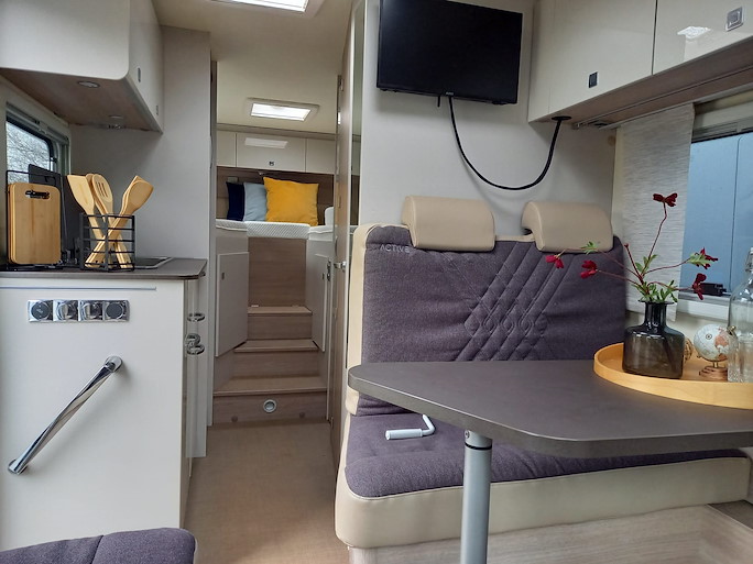 De camper is verder uitgerust met motorairco, cruise control, een luifel en een radio.