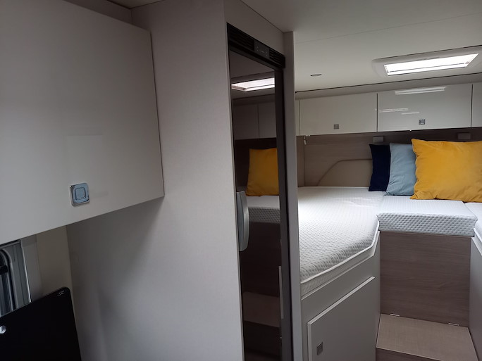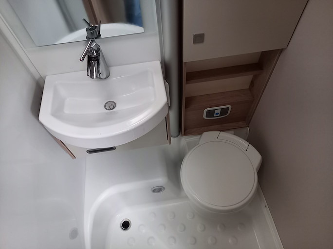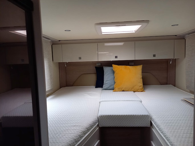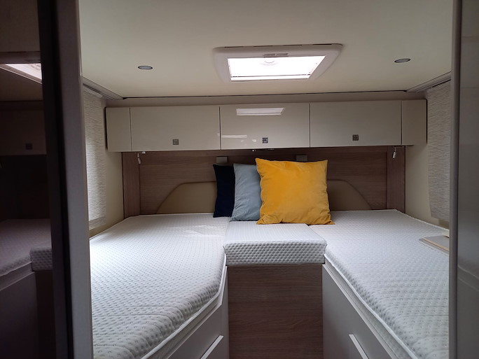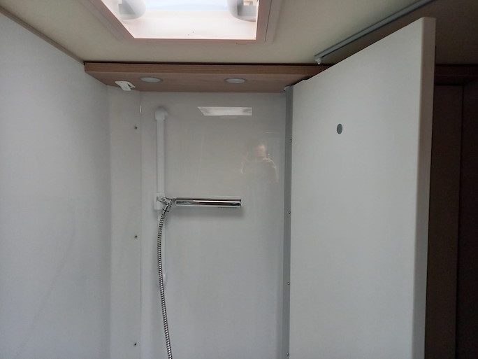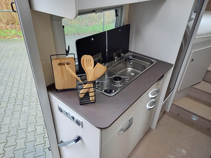 Slapen kan op de 2 enkele bedden achterin. De keuken heeft een 2-pits gasstel, koelkast met vriezer en een wasbak met mengkraan. In de doucheruimte zijn een toilet, wastafel met mengkraan en een douche aanwezig. Onder de enkele bedden is een ruime garage waarin ruimte genoeg is voor uw bagage. Eventueel kunnen hier ook fietsen in geplaatst worden.