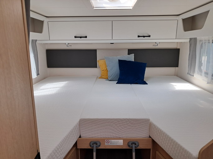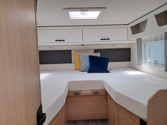 Slapen kan op de 2 enkele bedden achterin en bij meer dan 2 personen kan ook het 2-persoons hefbed gebruikt worden.