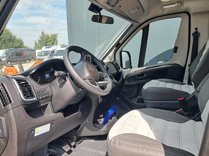 De Sunlight T68 is de meest ruime half-integraal camper met enkele bedden die we hebben. Het slaapgedeelte achterin is met een deur af te scheiden van het voorste deel van de camper. Deze indeling heeft 2 draaibare voorstoelen en kleine zijbank, zodat u ruim kunt zitten.
