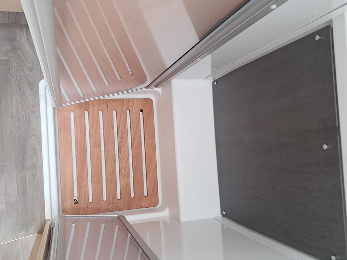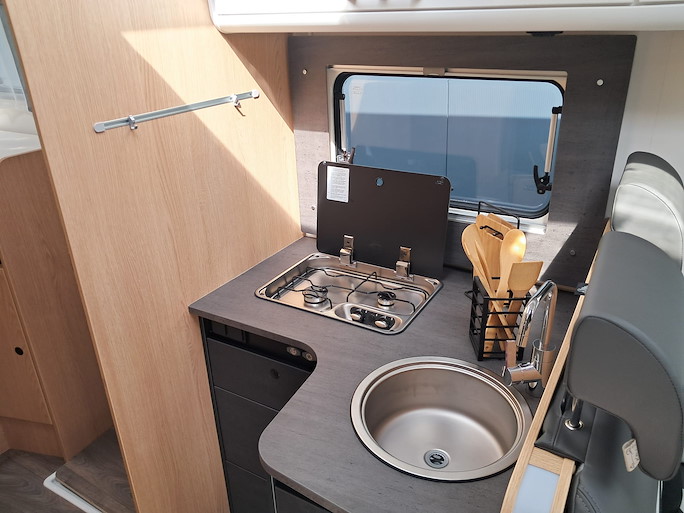 De keuken heeft een 3-pits gasstel, koelkast met vriezer en een wasbak met mengkraan. De douche- en toiletruimte zijn van elkaar gescheiden. De toiletruimte bevat tevens een wastafel met mengkraan.