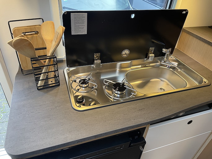 De keuken heeft een 2-pits gasstel, koelkast met vriezer en een wasbak met mengkraan. In de doucheruimte is behalve een douche ook een toilet en wastafel met mengkraan aanwezig.