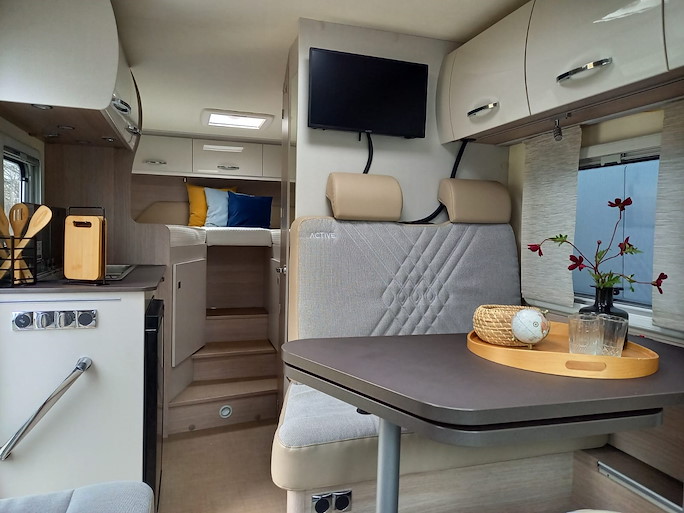 De camper is verder uitgerust met motorairco, cruise control, luifel en een radio.