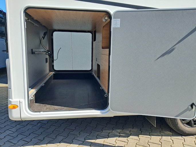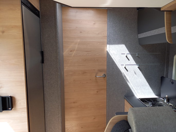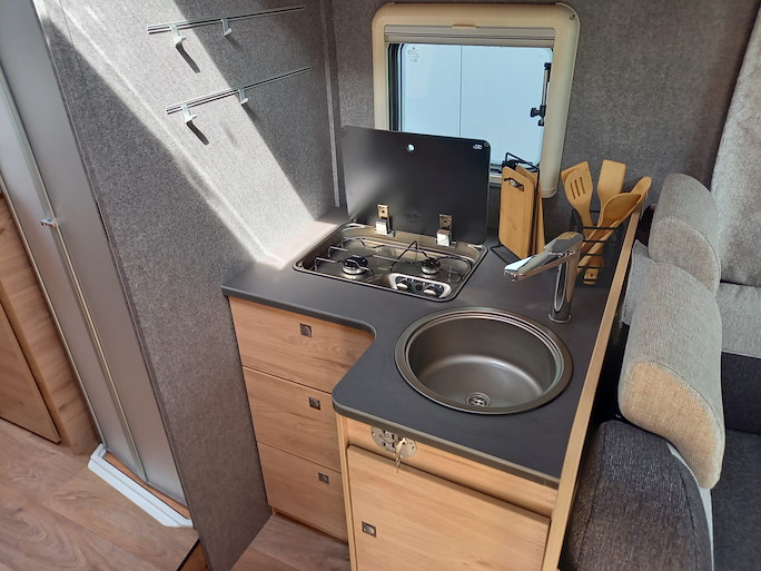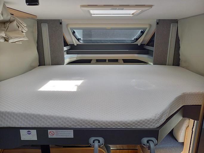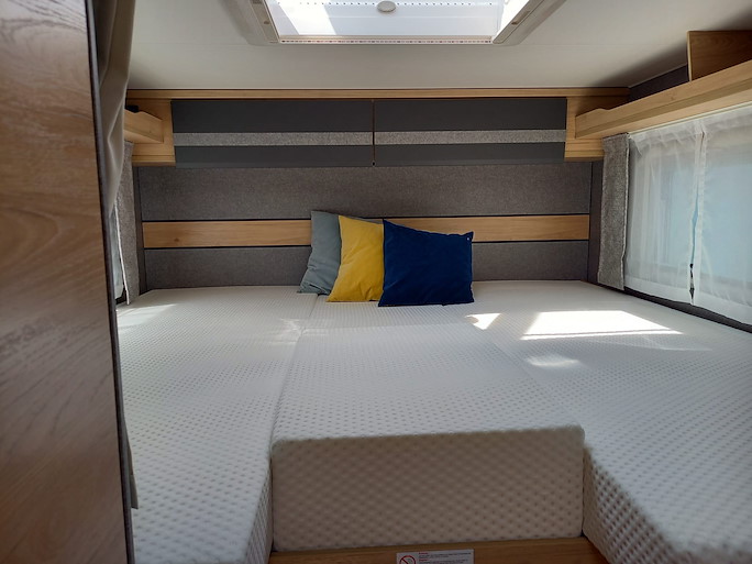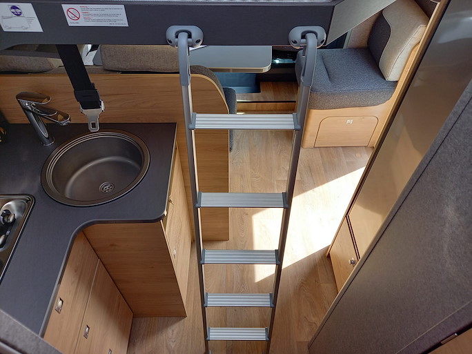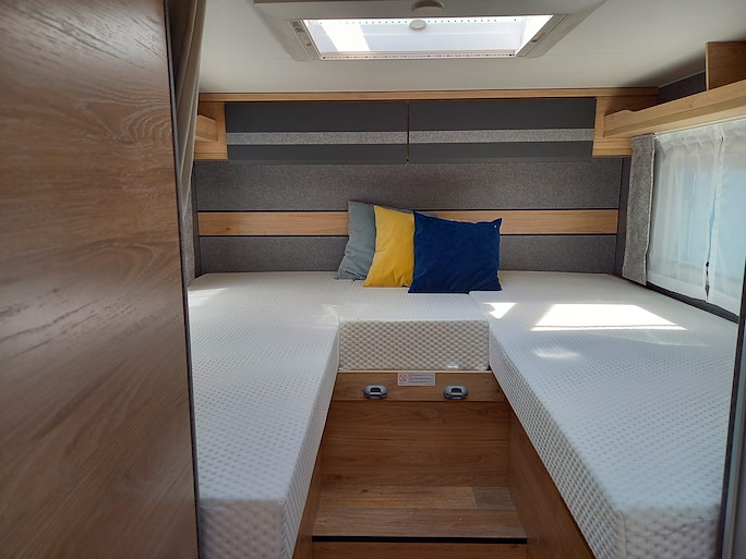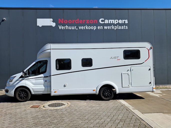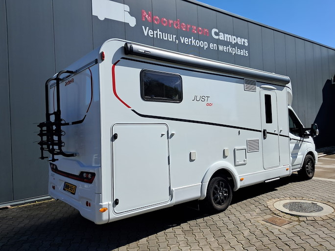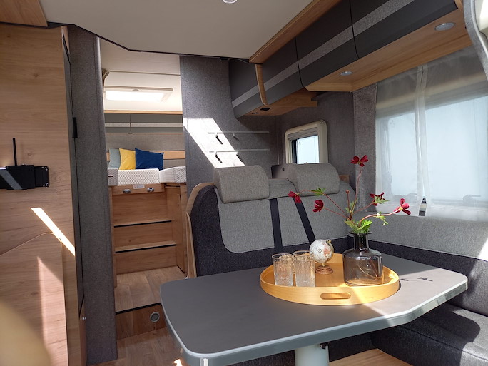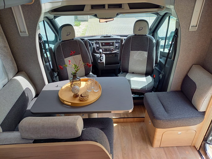 De Dethleffs Just Go is een ruime half-integraal camper met enkele bedden en hefbed. Deze indeling heeft 2 draaibare voorstoelen en een zitbank, waardoor u met 4 personen in de camper kunt zitten.