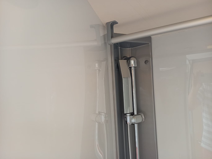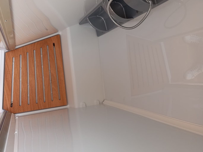 De keuken heeft een 2-pits gasstel, koelkast met vriezer en een wasbak met mengkraan. De douche- en toiletruimte zijn van elkaar gescheiden. De toiletruimte bevat tevens een wastafel met mengkraan.