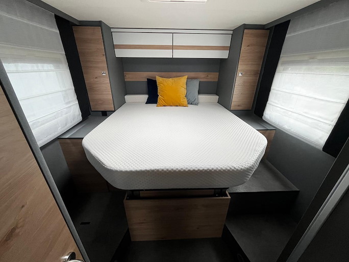Slapen kan op het ruime Queensbed achterin.