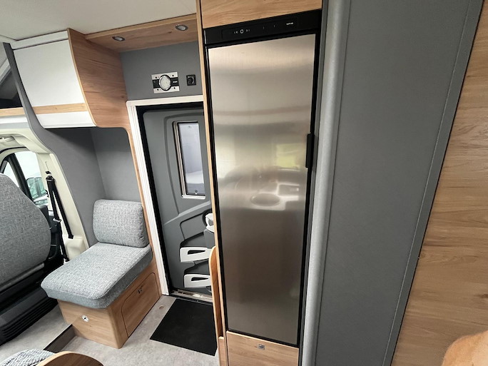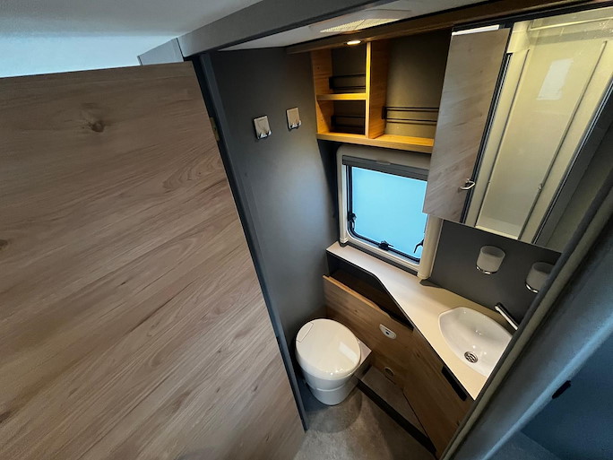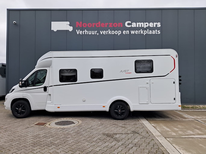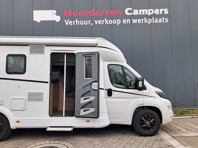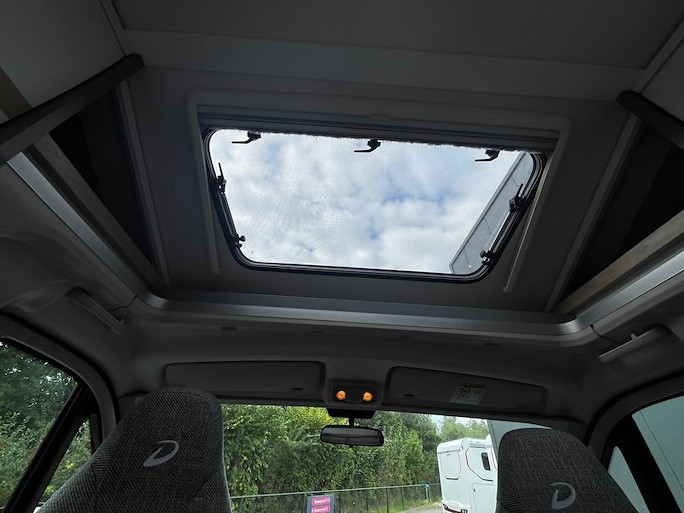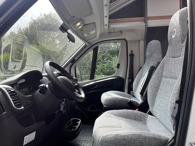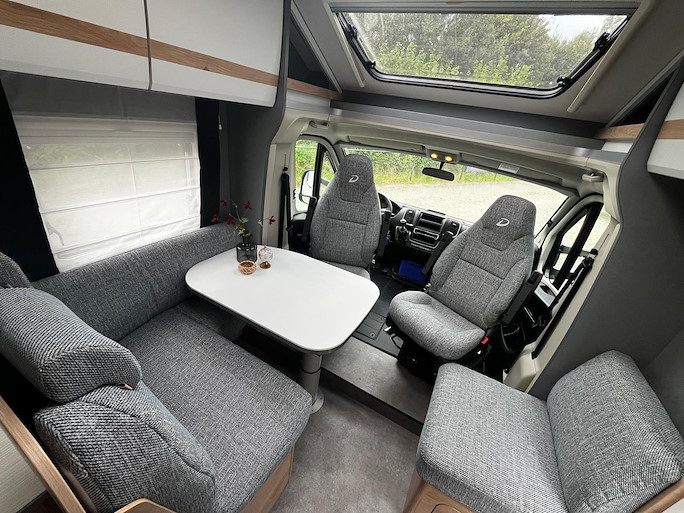 De Dethleffs Just Camp T7052 DBM is de meest ruime half-integraal camper met Queensbed die we hebben. Deze indeling heeft 2 draaibare voorstoelen en kleine zijbank, zodat u ruim kunt zitten.