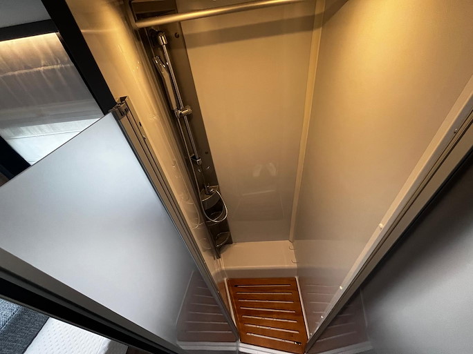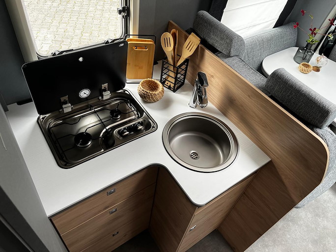 De keuken heeft een 2-pits gasstel, koelkast met vriezer en een wasbak met mengkraan. De douche- en toiletruimte zijn van elkaar gescheiden. De toiletruimte bevat tevens eens wastafel met mengkraan.