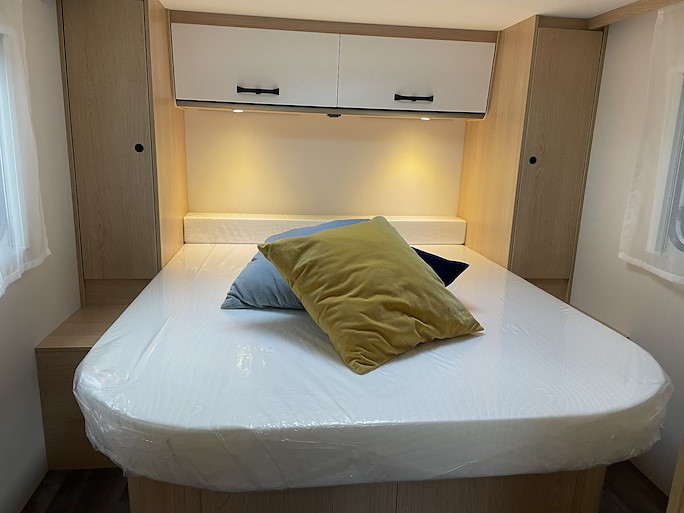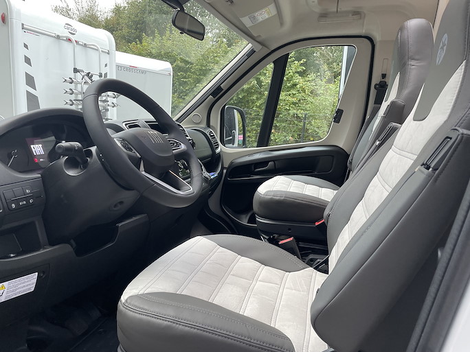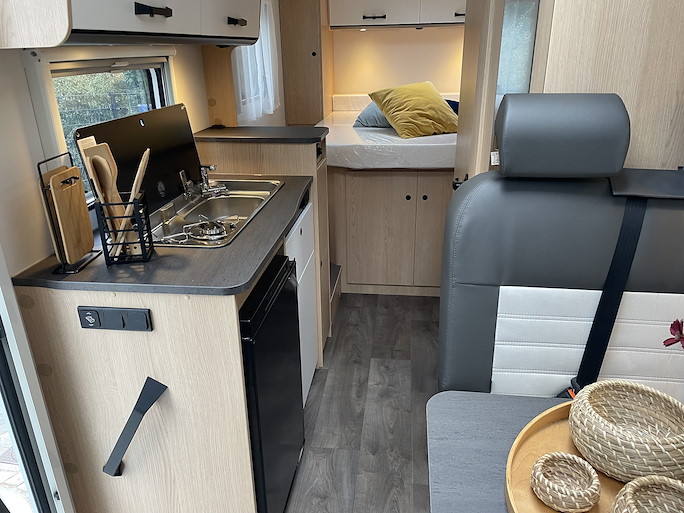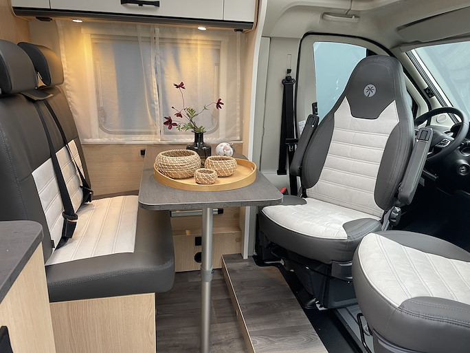 De Sunlight V69 Adventure automaat is de meest compacte half-integraal camper met Queensbed. Deze indeling heeft 2 draaibare voorstoelen en een zitbank, waardoor u met 4 personen in de camper kunt zitten.