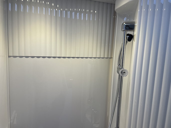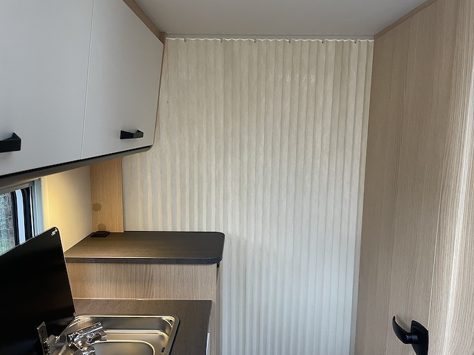 De keuken heeft een 2-pits gasstel, koelkast met vriezer en een wasbak met mengkraan. In de doucheruimte is behalve een douche ook een toilet en wastafel met mengkraan aanwezig.