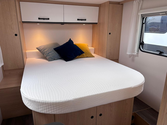 Slapen kan op het vrijstaande Queensbed achterin.